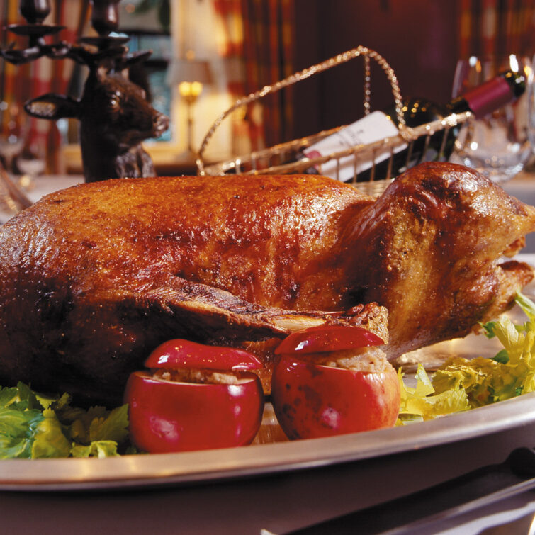 Bimöhler Bauernente mit Honigjus, Rotkohl, Bratapfel und Kartoffelklößen